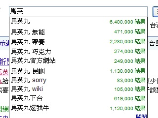 記者實際在Google上網(wǎng)搜尋,以馬英九為例,才打上“馬英”二個字,Google搜尋網(wǎng)頁上赫然自動跳出“馬英九,無能”,或是“馬英九,帶賽”等搜尋建議條件;在雅虎奇摩進行同樣搜尋時,則有十項搜尋建議產(chǎn)生,但無“無能”或“帶賽”的搜尋建議。