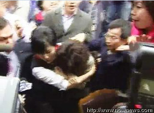 混亂中民進(jìn)黨籍“立委”邱議瑩被國(guó)民黨籍“立委”呂學(xué)樟推倒。國(guó)民黨籍“立委”徐少萍則是從背后熊抱民進(jìn)黨籍“立委”林淑芬,兩人因?yàn)橹匦牟环(wěn)跌倒在地上,徐少萍還堅(jiān)持不放手,十分拼命。