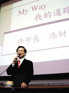 許添財(cái)于11日受邀到臺(tái)南大學(xué)演講,講題是“我的道路”,題目早在民進(jìn)黨大臺(tái)南市長(zhǎng)民調(diào)前就已定了,但因他在初選中落敗反應(yīng)他此時(shí)的心情。