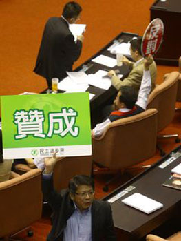 晚間10時,民進(jìn)黨團(tuán)在表決現(xiàn)場僅留下3 人,國民黨團(tuán)安排59人留守,因此,表決結(jié)果由國民黨團(tuán)主導(dǎo)。