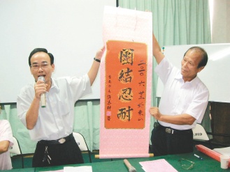 許添財(cái)之友會(huì)及臺(tái)南縣后援會(huì)干部近三百人昨天在臺(tái)南縣東山鄉(xiāng)聚餐,許添財(cái)雖未出席,但送來(lái)“團(tuán)結(jié)忍耐”中堂,會(huì)場(chǎng)彌漫主戰(zhàn)氣氛;會(huì)中決議,一旦許添財(cái)要參選大臺(tái)南市長(zhǎng),一定全力相挺。