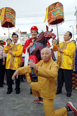 據(jù)“中央社”報道,在曾獲得“薪傳獎”的宜蘭布馬陣祖師爺林榮春帶領(lǐng)之下,馬英九穿上狀元戲服,戴上紅色官帽,騎著一匹道具馬,有摸有樣地扭了起來,令觀眾大飽眼福。