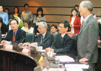 泛藍執(zhí)政縣市主張“立委”選舉和“公投”采二階段領投票,臺當局“行政院”昨天開鍘,把臺北市選委會主委吳秀光免職(左一)。圖為臺“中選會”主委張政雄(右一)二十一日邀集縣市地方選委會主委開會,吳秀光和張政雄各說各話,沒有交集。(臺灣《聯(lián)合報》資料圖片)