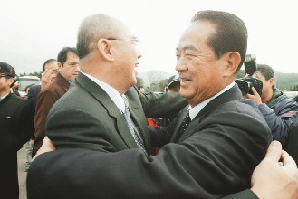 據(jù)臺灣《聯(lián)合報(bào)》報(bào)道,吳伯雄與宋楚瑜一見面即熱情擁抱,相互致意。媒體追問國親是否有合并計(jì)劃。宋楚瑜表示,國親有共同理念,“將以實(shí)際行動證明給大家看!眳遣蹌t語帶玄機(jī)地說,“請大家拭目以待!