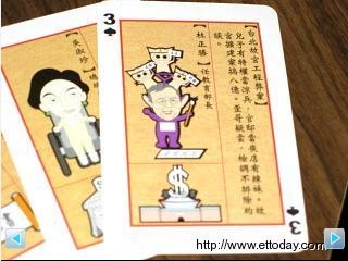 除了陳水扁以外,“紅心Q”上的陳水扁之妻吳淑珍拿著發(fā)票,旁邊寫“忙搜集股票、禮卷與發(fā)票。貪污被起訴。金孫穿戴英國名牌、吃高檔料理、都報(bào)公帳”;另外民進(jìn)黨2008參選人謝長廷,則在“方塊A”出現(xiàn),牌面寫著“立委謝長廷、跪拜宋七力、宇宙光明禮、一本賣兩萬”。