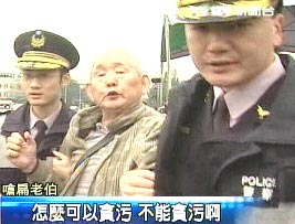 陳水扁在會(huì)上依舊鼓吹推動(dòng)“入聯(lián)公投”,但沒(méi)想到臺(tái)下卻有民眾嗆扁,嗆扁民眾隨即被警察帶走;但又有民眾高喊:“阿扁下臺(tái)!”嗆扁老伯念念有詞:“怎么可以貪污,不能貪污!”老伯隨后同樣也被架走。(高大林)