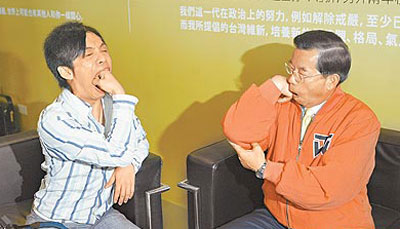 中新網(wǎng)3月12日電 據(jù)臺(tái)灣媒體報(bào)道,臺(tái)灣藝人大炳昨天與民進(jìn)黨候選人謝長(zhǎng)廷一起拍網(wǎng)絡(luò)偶像劇。兩人拍完后又進(jìn)行對(duì)話,一連串的冷笑話逗得現(xiàn)場(chǎng)媒體哈哈大笑。
