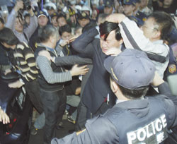 雖然謝營(yíng)早安排青年軍手臂勾著手臂排成人墻維持秩序,但群情激憤的綠營(yíng)支持者及部分干部還是“突破防線”,過程中,藍(lán)營(yíng)“立委”遭到推擠,并被追打了幾下,警車前方擋風(fēng)玻璃遭砸毀,警車車頂被踏扁,警察也被突來的無名拳打中胸部,由于民進(jìn)黨臺(tái)北市議員擋在警車前方,前后方又有四輛宣傳車堵住警車的去路,警車?yán)г谌巳褐,?dòng)彈不得。