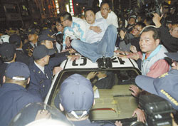 激動(dòng)的綠營(yíng)支持者甚至爬上車頂阻擋警車。
