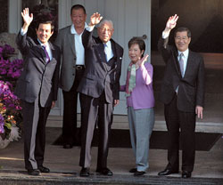 馬英九、蕭萬(wàn)長(zhǎng)27日下午4時(shí)半抵達(dá)李登輝寓所翠山莊。李登輝和夫人曾文惠在門(mén)口迎接馬蕭,四人臉上堆滿(mǎn)笑意。李登輝、馬英九主動(dòng)向守候媒體揮了揮手,隨后一起走進(jìn)屋內(nèi)。