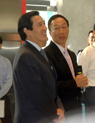 據(jù)“中央社”報(bào)道,郭臺(tái)銘今天下午四時(shí),在位于臺(tái)北縣土城市的鴻海精密公司,親自迎接馬英九的到來。一進(jìn)入公司大廳,郭臺(tái)銘向馬英九介紹張貼在大廳梁柱的一幅對(duì)聯(lián)。