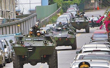 在裝甲車護(hù)送下,陳水扁及“部會首長”進(jìn)行指揮所轉(zhuǎn)移演練,過程逼真。