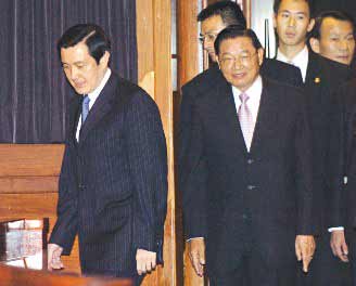 馬英九10晚在5.20后首次出席;鶗_商端節(jié)聯(lián)誼活動晚宴,與今天赴大陸展開兩會復(fù)談的;鶗麻L江丙坤一同進入會場。 聯(lián)合報圖