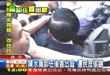 據(jù)“中央社”報(bào)道,陳水扁上午因出庭,在步入臺北地方法院時(shí),遭“愛國同心會”成員蘇安生突襲伸腿踹了一腳。蘇安生隨即被現(xiàn)場臺北市警方逮捕;訊后將依違反臺“社會秩序維護(hù)法”法辦。