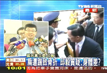 中新網(wǎng)7月22日電 昨天陳水扁出庭遭踹疑導(dǎo)致骨折,今天國(guó)民黨“立委”邱毅出面質(zhì)疑,是否有造假的可能。邱毅表示,如果被踢一腳就受傷,身體也太差了。