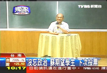 鼓勵(lì)學(xué)生,也像在鼓勵(lì)自己,蘇貞昌提到:“有時(shí)候選舉,也是這次沒有支持你,你跟他,喔…不共戴天,非報(bào)這個(gè)仇不可,這樣選舉沒3次,你就都沒朋友了,所以各位同學(xué),如果上次沒有投票的,(記得)下一次!