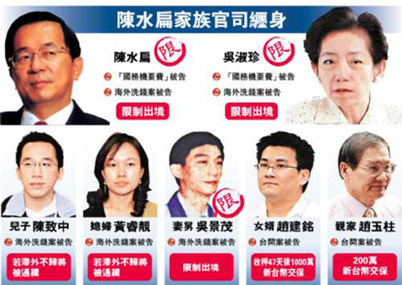 陳由豪對陳水扁“黑金疑云”開出關鍵第一槍之后,引發(fā)多米諾骨牌效應,接下來的四年,每次陳家曝光新的貪腐丑聞,臺灣老百姓都被嚇得目瞪口呆。陳水扁2004年連任后實行財產信托,申報財產從1994年任臺北市長前的1000萬元,飆漲到2003年底的7000萬元,股票市值從最初的55萬增至3億多元;2004年,媒體爆出吳淑珍收受SOGO百貨總值880萬元購物禮券,介入SOGO經營權爭奪戰(zhàn);2006年5月,陳水扁的女婿趙建銘被指控涉嫌臺開股票內線交易;2006年6月,吳淑珍卷入“國務機要費案”。