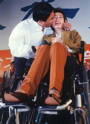 陳水扁出獄后,便推著妻子的輪椅,開啟了自己的競選常勝之路。從“立委”選舉到臺北市長選舉,再到2000年、2004年兩次臺灣地區(qū)領(lǐng)導(dǎo)人選舉,但凡選情混沌不明或者處于劣勢之際,半身癱瘓的吳淑珍就會挺身而出,打出無堅不摧的悲情牌。