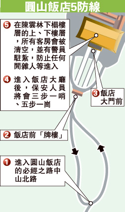 圓山飯店地形位居臺(tái)北的小山丘上,具保安優(yōu)勢(shì)。據(jù)悉,為阻絕綠營(yíng)方抗議民眾可能靠近飯店,警方會(huì)在陳云林訪臺(tái)期間,在飯店內(nèi)外設(shè)置5道關(guān)卡,其中在門外設(shè)置三道防線(見示意圖),最外圍是進(jìn)入圓山飯店唯一入口前的中山北路,這里距離飯店約500米,而飯店前的“牌樓”則是第二道關(guān)卡,距飯店大廳約200米。