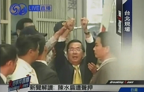 臺(tái)灣“今日新聞”報(bào)道說,陳水扁下午4時(shí)30分許步出特偵組準(zhǔn)備上車時(shí),面對(duì)媒體高舉銬著手銬的雙手,喊完口號(hào)才上車,一副從容就義的模樣,顯然有備而來。