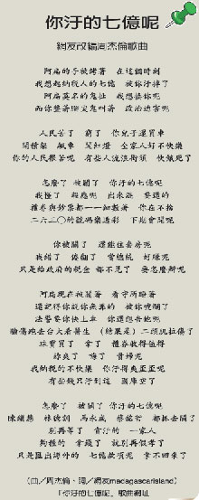 看來網(wǎng)友的填詞和寫詩功力,更勝阿扁一籌;最近即有網(wǎng)友、將周杰倫“魔杰座”專輯的歌曲“說好的幸福呢”,改編成“你污的七億呢”,透露對(duì)洗錢案的無奈。