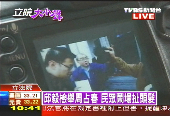 中新網(wǎng)12月15日電 綜合臺(tái)灣媒體報(bào)道,陳水扁日前遭到無保釋放,“立委”邱毅今天(15日)前往“監(jiān)察院”檢舉承辦法官周占春瀆職,不過沒想到步出“監(jiān)察院”時(shí),與綠營(yíng)民眾發(fā)生肢體沖突,甚至有人一把扯下邱毅的頭發(fā)。