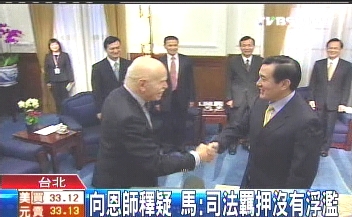 中新網12月16日電 馬英九在美求學時的老師孔杰榮質疑臺相關部門對陳水扁案件司法羈押的正當性;今天馬英九接見這位恩師時澄清,上手銬不是針對個人,臺灣司法羈押也沒有浮濫的情況。