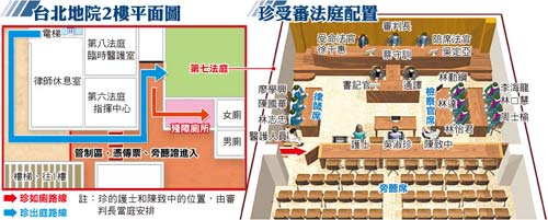 合議庭考慮吳淑珍身體狀況,預計這兩天各開庭4小時。法院也開放第八法庭給臺大醫(yī)院放置臨時病床、心電觀察儀器和呼吸器材,兩名醫(yī)師、兩名護士也可在此休息,法院外也將有救護車待命。由于臺大仍認為吳淑珍不適合長時間坐著,合議庭今將每30分鐘讓她休息一下,由醫(yī)護量心跳及血壓,她若有需要,可在被告席桌下擺一臺電暖器保暖。
