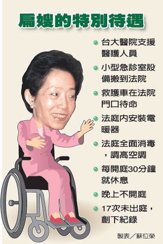 為了防止上次開(kāi)庭過(guò)程中,吳淑珍體力不支昏倒的情況再次發(fā)生,臺(tái)北地院更是做了萬(wàn)全的準(zhǔn)備,不僅審理合議庭的第七、第八法庭在幾天前已經(jīng)全面消毒,法院在吳淑珍的被告席桌下放置了兩臺(tái)電暖器,開(kāi)庭的過(guò)程中,空調(diào)更會(huì)設(shè)定為恒溫?cái)z氏28度。