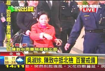 吳淑珍是在今日下午1點45分左右,搭乘一輛廂型車離開寶徠寓所,準備前往臺北地方法院應訊,并提早在2點10分抵達地院。稍早傳出吳淑珍因為小感冒身體微恙,但今天下午一身橘紅色名牌外套的吳淑珍,氣色似乎沒有想象的差,也沒有像以往在鏡頭前出現的虛弱。