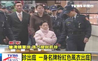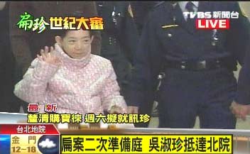 吳淑珍素顏穿著一身名牌粉紅色風(fēng)衣,和2年前出庭時穿的是同一款。手上沒有帶任何鉆戒與寶石。扁辦秘書江志銘表示,吳淑珍在出門前已經(jīng)先吃過藥了,身體應(yīng)該可以撐過2到3小時的庭訊;在警察戒備下,進入第七法庭旁邊的候?qū)徥摇?
