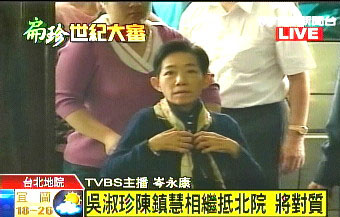 中新網(wǎng)3月17日電 據(jù)臺灣TVBS報道,17日下午2點24分,陳水扁夫人吳淑珍穿著藍(lán)色針織毛衣,披著絲巾,在兒子陳致中的陪同下,進(jìn)入法院。陳鎮(zhèn)慧則是戴著大墨鏡,白外套、黑上衣,低調(diào)進(jìn)入法院。今天首次進(jìn)入實質(zhì)審理,雙方對質(zhì),備受注目!
