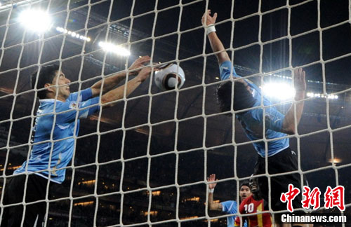 中新網(wǎng)7月3日電 在今天凌晨進(jìn)行的一場(chǎng)世界杯1/4決賽中,烏拉圭點(diǎn)球淘汰加納,40年后再度晉級(jí)四強(qiáng)。而在加時(shí)賽中場(chǎng)階段用一個(gè)“排球動(dòng)作”幫助球隊(duì)擋出加納隊(duì)射門(mén)、被紅牌罰下的蘇亞雷斯,堪稱最大功臣。