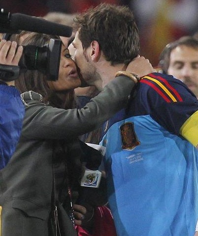 比賽結(jié)束后,身為體育主播的卡西美艷女友自然要采訪西班牙的功臣,訪談結(jié)束后,她在眾目睽睽之下現(xiàn)場為圣卡西送上香吻。