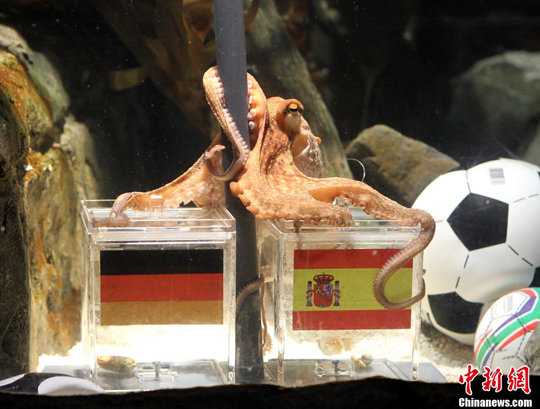 世界杯開(kāi)賽后,來(lái)自德國(guó)的章魚(yú)“保羅”已經(jīng)成功預(yù)測(cè)對(duì)了此前德國(guó)隊(duì)五場(chǎng)比賽的勝負(fù)結(jié)果,頓時(shí)名聲大振。半決賽前,德國(guó)人再次請(qǐng)出“保羅”預(yù)測(cè),這次“保羅”預(yù)測(cè)的是西班牙獲勝。沒(méi)想到,它又對(duì)了!