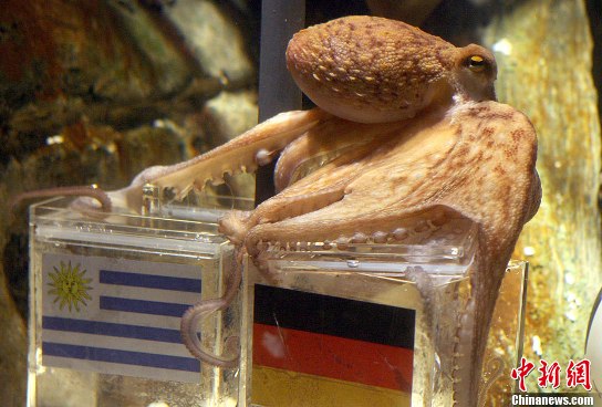 章魚“保羅”絕對是本屆世界杯賽的大明星,對德國隊的比賽的競猜他已經是屢試不爽。除了兩年前尚處在幼年的它對歐洲杯預測6中其5,猜錯了決賽外,其他的比賽,包括本屆世界杯賽,它猜中了13場比賽中的12場!