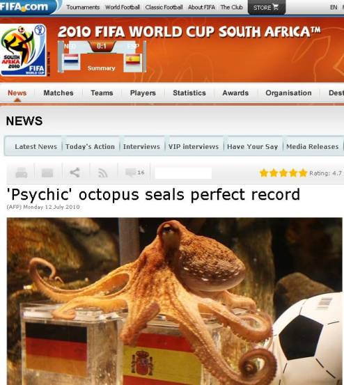 章魚保羅預(yù)測決賽中西班牙將擊敗荷蘭隊奪冠。雖然比賽被拖到加時的116分鐘,但伊涅斯塔的進(jìn)球還是讓保羅的神奇再次延續(xù),這也是它在本屆世界杯上成功預(yù)測的第8場比賽,而且其預(yù)測成功率為100%!它所預(yù)測的比賽,除了這場決賽,還有德國隊的全部七場比賽。