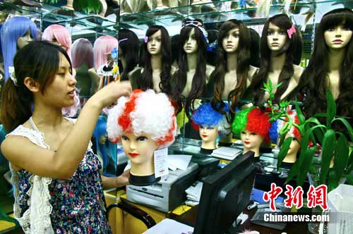 楊向梅,義烏絲黛假發(fā)在商貿(mào)城內(nèi)店鋪的負(fù)責(zé)人。今天一見(jiàn)到記者就開(kāi)心地問(wèn)到,“昨晚決賽你看到球迷頭上帶的國(guó)旗假發(fā)沒(méi),那里面一定有我們廠制造的!
