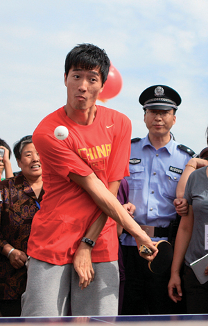 在劉翔作為奧運冠軍代表致辭后,當(dāng)天的與市民互動活動也拉開了序幕,劉翔把自己的各個絕活兒全部亮相,陪市民打乒乓球、踢毽子,十分賣力。他一如既往地用上了自己的搞怪天賦,旁邊圍觀的市民都說他“沒架子,很隨和”。事實上,作為全民健身志愿者,劉翔之前已經(jīng)參加過上海的全民健身活動,還在盧灣體育館和市民一起打起了羽毛球。受傷不玩大球項目的劉翔,在乒羽等小球上頗有“功力”,曾經(jīng)還在莘莊基地工會組織的職工運動會上參加田徑隊打過乒乓球賽并取得好成績。