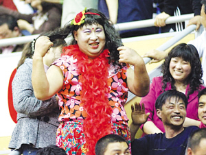 昨天的南京奧體看臺(tái)上,還來(lái)了一位貌似乳神的人,這究竟是什么回事呢?昨天比賽還沒(méi)開始,奧體中心體育場(chǎng)的50區(qū)看臺(tái)就熱鬧無(wú)比。很多球迷紛紛圍到一名打扮性感的人邊上,爭(zhēng)相與“她”合影。而本報(bào)記者也從內(nèi)場(chǎng)走到看臺(tái)附近一探究竟。原來(lái),這是一位老舜天球迷,聞之巴拉圭正版乳神因故未能前來(lái)南京,為了彌補(bǔ)大家的遺憾,也是順便活躍一下現(xiàn)場(chǎng)氣氛,照著巴拉圭乳神里克爾梅的外形好好地裝扮了一下自己。由于這位男球迷是反串表演,所以他還特意用材料加以修飾,讓自己胸部的豐滿程度更加接近于乳神。于是,他便成為了昨天現(xiàn)場(chǎng)最為“耀眼”的明星,受歡迎程度甚至超過(guò)了巴拉圭球星圣克魯斯。除了這位比較搞怪的球迷,昨天來(lái)自全國(guó)各地的著名球迷也聚集奧體中心,“羅西”、“胖哥”等等耳熟能詳?shù)拿譃槟暇⿰W體中心的這場(chǎng)中巴之戰(zhàn)增色不少。
