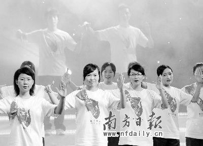 大學(xué)生們晚會現(xiàn)場學(xué)習(xí)手語,為亞運會到來做全面準備。南方日報記者王輝攝