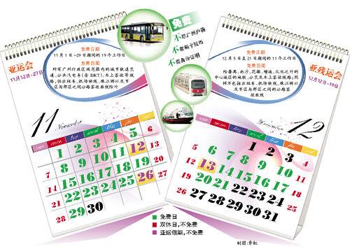 廣州日?qǐng)?bào)11月1日?qǐng)?bào)道亞運(yùn)免費(fèi)公共交通優(yōu)惠大禮包今天起派發(fā)到位。從11月1日到11月29日的19個(gè)工作日里,全市所有公交、地鐵、水巴可免費(fèi)搭乘。廣州市交委表示,無(wú)論是本地人還是外地人,不需要刷卡或投幣,也不需要出示任何身份證明,即可免費(fèi)乘車(chē)。