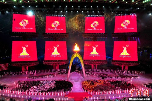 隨著中國(guó)總理溫家寶正式宣布亞運(yùn)會(huì)開幕,整個(gè)會(huì)場(chǎng)和天空再次被無(wú)數(shù)絢爛的煙火照亮。