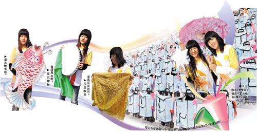 最值得一提的是,在海心沙舞臺(tái)上,每名合唱隊(duì)員都有一個(gè)道具“百寶箱”,這個(gè)藍(lán)色布袋中裝著6件“秘密武器”,需要配合不同歌曲來表演,營造舞臺(tái)氣氛。其中有《月光光》時(shí)的浪花板和魚板,《櫻花》時(shí)的粉紅小傘,印尼歌曲時(shí)的星星索,印度歌曲時(shí)的紗巾,黎巴嫩歌曲時(shí)的小鼓。