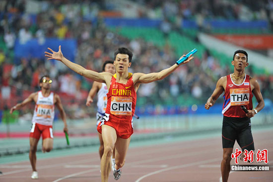 中新網(wǎng)11月26日電 在26日晚結(jié)束的廣州亞運(yùn)會(huì)田徑男子4x100米接力決賽中,新科亞洲“百米王”勞義與陸斌、梁嘉鴻和蘇炳添組成的中國(guó)隊(duì)以38秒78的歷史最好成績(jī)奪得冠軍,20年之后再次奪得亞運(yùn)會(huì)接力冠軍。