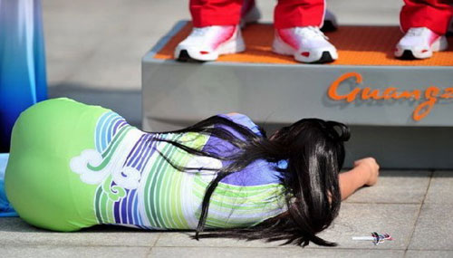 就在“暈倒姐”事件發(fā)生的前兩天,在亞運(yùn)會(huì)射擊比賽的頒獎(jiǎng)儀式上,一名叫蘇婉君的禮儀小姐也是托著裝滿(mǎn)獎(jiǎng)牌的盤(pán)子,累得發(fā)抖,幸被獲得冠軍的外國(guó)選手幫忙。據(jù)蘇婉君介紹,那個(gè)擺放了鮮花或獎(jiǎng)牌的托盤(pán)很沉,即使什么東西也不放,分量也是非常重的。