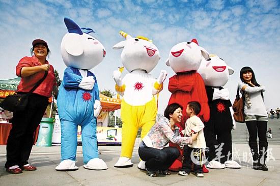 特別值得一提的是,活躍在場館內外、街頭巷尾、公交的士上的吉祥物。他們在比賽間隙歡快起舞,與游人親密合影,甚至走進首都機場、上海世博。
