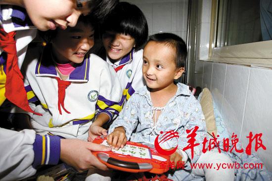 6歲的小華琛坐在兒童醫(yī)院的病床上,雙腳打著石膏———這是他第三次打石膏做矯正。他從小失去父母,又患有先天性馬蹄內翻足,性格內向。不過,來廣州近一個月的日子,他不斷被熱心人改變著。1日,廣州市第13中學8名學生代表也來到兒童醫(yī)院探望小華。ㄒ娪覉D)。