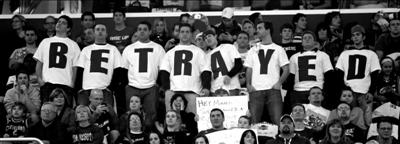 幾名球迷用上衣組成了“背叛”字樣,在現(xiàn)場發(fā)泄著被詹姆斯遺棄后的怨氣。