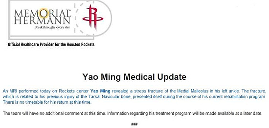 姚明的具體治療方案和計(jì)劃預(yù)計(jì)將在晚些時(shí)候公布。雖然在全明星計(jì)票中領(lǐng)跑西部,但姚明恐怕將再次因傷錯(cuò)過2011年的全明星賽。